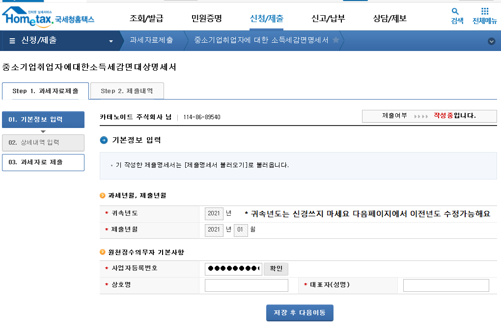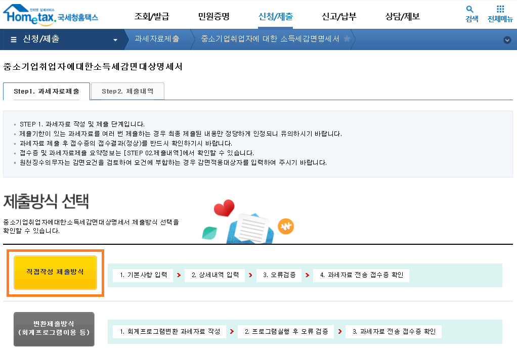이전에는 별도의 소득세감면 신청서를 각 관할 세무서로 우편발송을 해야하는 어려움이 있었지만, 이제는 아래와 같이 홈텍스로 쉽게 신청이 가능합니다.
